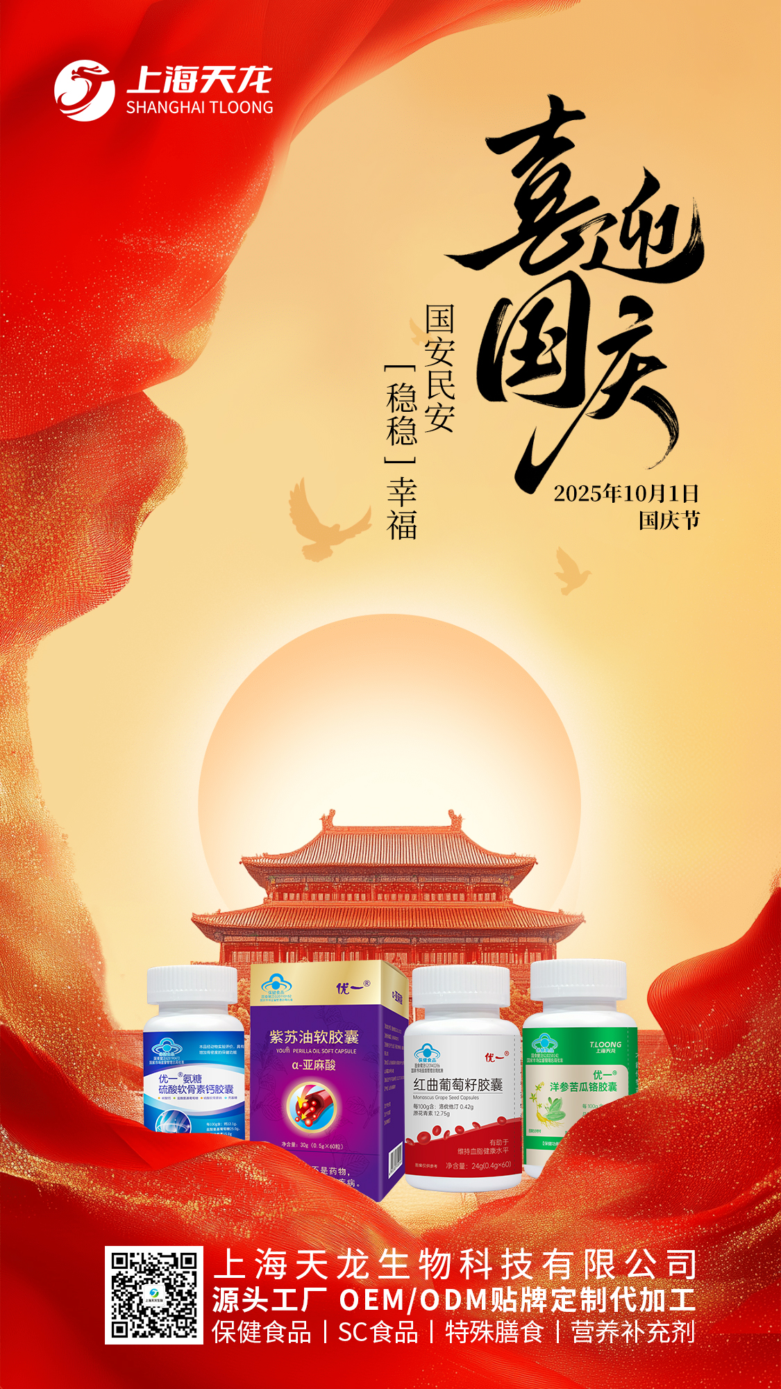 金秋十月,華誕同慶。2025年國(guó)慶假期將至,上海天龍生物向您致以最誠(chéng)摯的問(wèn)候!愿您卸下忙碌,享受與家人團(tuán)聚的溫馨時(shí)光,收獲滿滿的幸福與能量。祝您假期愉快,闔家安康!